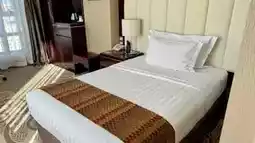 Situated right off the main square, this hotel provides a comfortable stay with excellent service. The staff efficiently arranged an airport transfer and even provided me with an early room check-in, which I greatly appreciated. The lobby area is spacious, featuring intriguing art and an impressive chandelier. I stayed in a corner room on the thirteenth floor, offering a fantastic view over the square and plenty of natural light. The heating couldn't be completely turned off, but the windows open, though city noise is considerable. Fortunately, there was no noise from other rooms or the hallway. It was inconvenient that no electric sockets were near the bed, yet the room was otherwise comfortable. The pillows were excellent and everything was clean. The bathroom was roomy with a window into the main room, featuring a shower over the bathtub. Robes were absent, but slippers and small toiletry bottles were provided. Housekeeping was efficient, always respecting the 'do not disturb' light. Breakfast was relaxing, featuring a live egg cooking station and a reasonably varied buffet. The “Premium Lounge” on the top floor was fantastic—great service, views, live music on some evenings, and a good food menu, all well presented and cooked. It was a perfect spot to unwind in the evening and a standout feature of the hotel. I would definitely consider staying here again and recommend it for its central location.