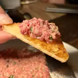 Fresh Kuroge Wagyu beef is seared and served on buttered toast. The light meat flavor and rich buttered toast are an exquisite combination.
