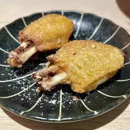 The yakitori is served without being skewered. This dish is made by wrapping chicken liver in ami fat, making it juicy.