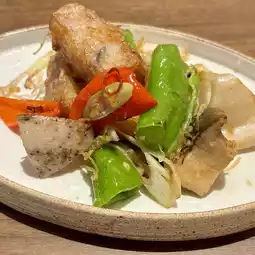 Homemade radish mochi stir-fried with bell peppers, lotus root, and king oyster mushrooms. A masterpiece that allows you to enjoy the crispy texture of vegetables and fluffy radish mochi.