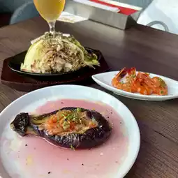 Choose 3 from 14 tapas options. Among the dishes, the Turkish dish "Bosan no Monzetsu" stands out with its impressive stew of fried tomatoes, onions, and garlic sandwiched between fried eggplant. The roasted cabbage is served with anchovy sauce.