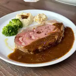 A portion as large as a steak. Slowly cooked to a moist texture, the secret to its deliciousness is the exquisite balance of lean meat and fat.
