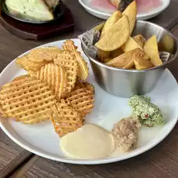 Available in two types: natural cut and waffle cut, allowing you to enjoy different textures. Another appealing feature is the choice of three dipping sauces, including anchovy and garlic butter.