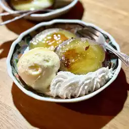 A luxurious flavor that brings out the sweetness of caramelized sweet potato, enjoyed with creamy vanilla ice cream and fresh cream.