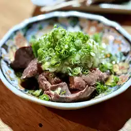 Freshly slaughtered chicken liver is quickly grilled rare over charcoal and enjoyed with salt and sesame oil.