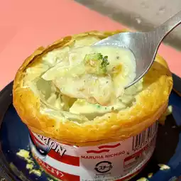 Enjoy the crispy texture of the pie crust and the creamy clam chowder together.