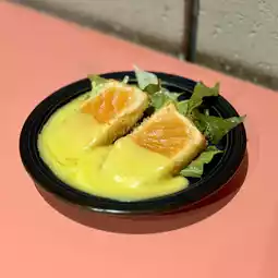 Rare salmon cutlet topped with melted rich cheese. Crispy on the outside and juicy on the inside.