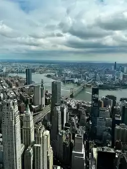 Landmarks like the Statue of Liberty, the Empire State Building, and Brooklyn Bridge appear like pieces in a grand urban puzzle. The atmosphere is calm yet filled with excitement as visitors take in the view, cameras ready. Watching the sunset from up here is unforgettable, with the city lights slowly taking over the skyline. One World Observatory captures the true spirit and energy of New York from above.