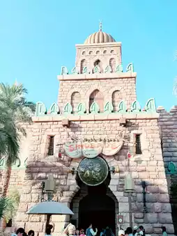 The Arabian Coast at Tokyo DisneySea is a themed area inspired by the classic animated film "Aladdin," recreating the Arabian-style palaces, markets, and mysterious streets. The vibrant colors of the buildings, along with arches and spires, create an exotic atmosphere that makes visitors feel as if they've stepped into the Kingdom of Agrabah. Key attractions include interactive experiences like "The Magic Lamp Theater," where guests can embark on a magical flying carpet ride through a fantastical world. The area also features themed restaurants and shops offering Aladdin-inspired cuisine and exclusive merchandise. The streets are filled with music from the film, performances, and interactive activities, enhancing the fun and immersive experience. At night, the Arabian Coast becomes even more enchanting with its illuminated lights and music, making it a romantic and mysterious hotspot for families, Disney fans, and visitors looking to capture magical moments and immerse themselves in a fairytale world. It perfectly showcases the exotic and fantastical charm of DisneySea.