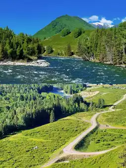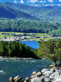 Hemu Village is nestled in the Altai Mountains, bordering Kazakhstan, Russia, and Mongolia. It is a place full of mystery and beauty. The village is surrounded by dense forests, with larch trees and clear rivers complementing each other. In the distance, the continuous snow-capped mountains remain covered with snow all year round. The lush forests and fresh air invite deep breaths, and the crystal-clear rivers create a stunning picture. During dawn or dusk, sunlight filters through the treetops and bathes the village in a dreamy, enchanting light, making it a paradise for photography enthusiasts.
