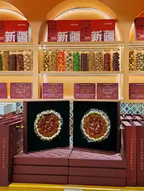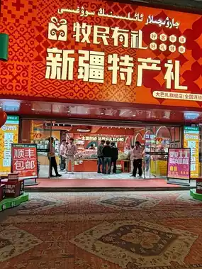 The shop named "Herdsman's Gift: Xinjiang Specialty Souvenirs" is filled with strong Xinjiang ethnic characteristics. A cute cartoon sheep at the entrance warmly welcomes guests, while the interior boasts vibrant and distinctive decor. Shelves are lined with a wide array of Xinjiang nuts, dried fruits, and the famous handmade nut cake, showcasing the region's abundant natural products. Whether as souvenirs or for personal enjoyment, this is the perfect place to discover delicious flavors full of local character.
