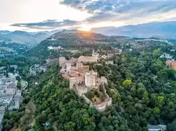 ◦ Images 5-9 showcase its various facets: aerial views reveal its forest surroundings and snowy peaks of the Sierra Nevada (Images 5-6); the Court of the Lions (Image 7) features the iconic Twelve Lions Fountain, a pinnacle of Moorish art; the Myrtle Courtyard (Image 8) boasts stunning colonnades and intricate carvings; the Hall of Ambassadors (Image 9) is adorned with Arabic inscriptions and geometric patterns, transporting you back to the medieval Islamic kingdom.