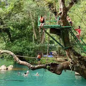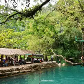 The highlight of Blue Lagoon is the crystal clear emerald pool, which is made from natural minerals. It has become the signature of this place. A popular activity for tourists visiting Blue Lagoon is playing in the water because the water is clear and cool, especially from March to October. There are also two levels of jumping activities to choose from. The lower level is jumping from a large branch that extends into the middle of the pool. The upper level has a steel balcony attached to a large tree for those who are not afraid of heights.