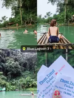 💫 Blue Lagoon 3, there are 3 places, but I woke up late. Only went to one place 555🔹Rent a car yourself for 200,000 kip. They will wait to pick us up or you can buy a tour. Go to many places 🔹Entrance fee 10,000 kip per person 🔹Life jacket rental fee, free float 🔹16km road is hellish but the view along the way is a million 🔹No matter what camera you use, it's not as beautiful as what you see with your own eyes 🔹Blue Lagoon 3, there are few people, the water is very cold. Ask if it's beautiful, I think the view is more beautiful 55555 🔹Good-looking oppa, lots of foreigners, try to get to know more friends 5555