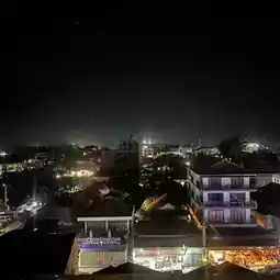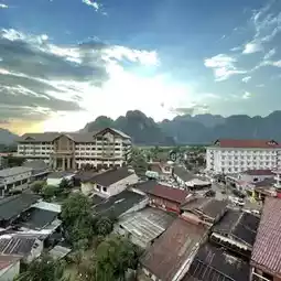 🏨PM Hotel is located in the heart of Vang Vieng and near the famous Sakura 🌸 shop. It is a newly built hotel that just opened in mid-2020. The building is 7 floors high and 🌃 has a rooftop restaurant with music playing every night, surrounded by a 360-degree view of Vang Vieng.