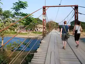 Atmosphere: An untrustworthy bridge with gaps between wooden planks… This bridge offers a beautiful view of the river and surrounding mountains in Vang Vieng, so don’t miss this during your stay!