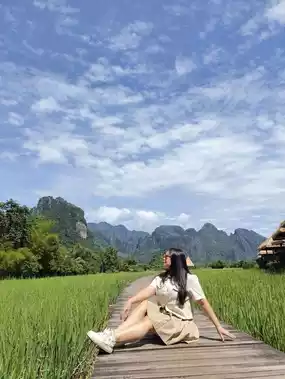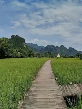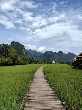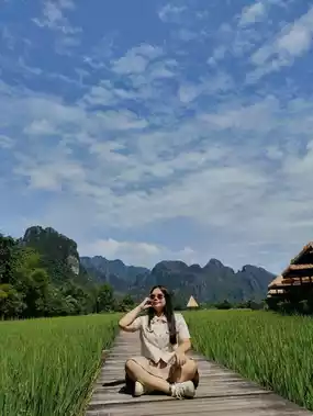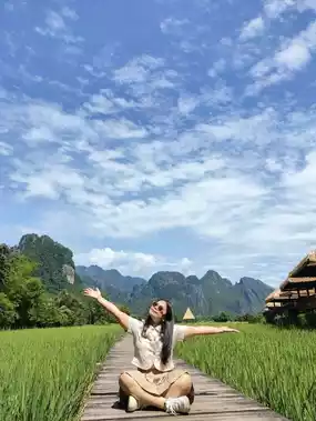 "Vieng Tara Villa" is a beautiful, super chill place nestled amidst lush rice paddies. Rooms offer stunning mountain views of Vang Vieng and the Song River. The atmosphere is a perfect 10 out of 10, and it's quiet and makes you feel like you're truly surrounded by nature. The rooms are fully equipped with amenities, perfect for selfie lovers. It's also close to attractions like the Blue Lagoon, Tham Jang Cave, and the tubing area.