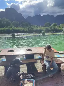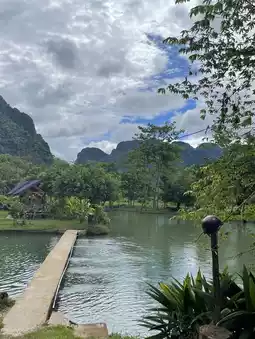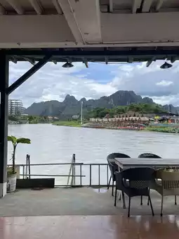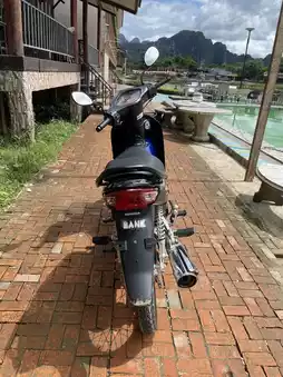 - When we arrived in Vang Vieng, we rented a three-wheeled vehicle to our accommodation. Today, we stayed at Riverview Bungalow. We rented a motorbike from our accommodation (I recommend finding a reliable rental place). We got it for 80,000 kip, at that rate 460:1.