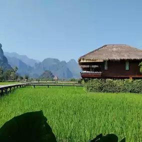 Coordinates for taking photos with the wooden bridge, rice fields, and Vang Vieng mountain range
