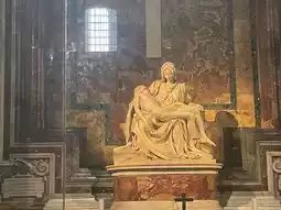 Just to the right as you enter the cathedral is Michelangelo's Pieta (Pietà) sculpture. Pieta means "pity" and depicts the Virgin Mary holding Jesus on her lap after he has been taken down from the cross.