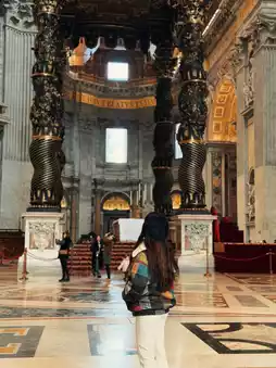 The 30m-tall bronze canopy over the main altar features four spiral columns inspired by Jerusalem's Temple, topped with papal symbols of keys and crown representing divine authority.