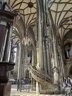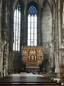 The cathedral’s interior is as impressive as its exterior. High vaulted ceilings rise between Gothic columns, and enormous stained-glass windows fill the space with color and light. The Abbot’s Pulpit dazzles with its detailed stone carvings, while the main organ and Baroque chapels are also worth seeing.