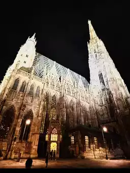 Stephen's Cathedral, illuminated by lights, appears even more majestic, its spires piercing the night sky.