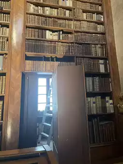 The collected books are still preserved today. While they cannot be opened, visitors can marvel at the variety of books on display, including oversized volumes, thick tomes, and beautifully designed covers, making it a fascinating experience. Additionally, some of the numerous bookshelves have doors, hinting at hidden rooms behind them, which adds an intriguing element to the visit.