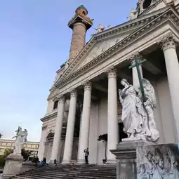 Walk a few more steps to Karlskirche across the street and look at the Baroque dome and the reflection of the pool water.