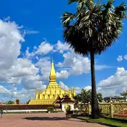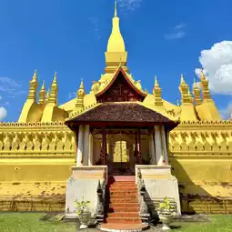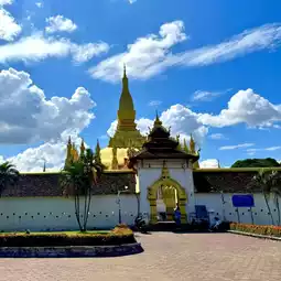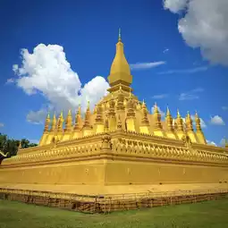 🛕 Pha That Luang Vientiane has a distinctive architectural style. The golden pagoda is 45 meters high, with a square base. The east and west sides are 69 meters long each. Beside Pha That Luang, there are 2 temples: Wat That Luang Nuea and Wat That Luang Tai. The age of Pha That Luang is approximately 2,000 years, similar to that of Phra That Phanom in Thailand.