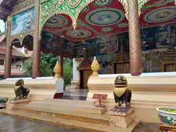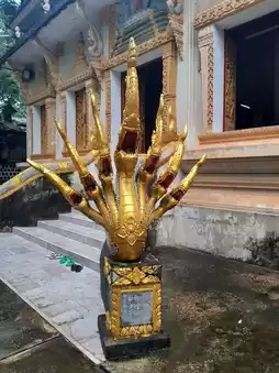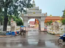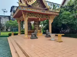 Wat Inpeng is hard to miss, sitting right in the heart of Vientiane’s main street. A large golden gate flanked by two guardian statues welcomes you in. There’s also a quieter side entrance that leads in from a nearby street, should you prefer a more understated approach.