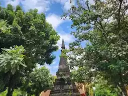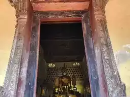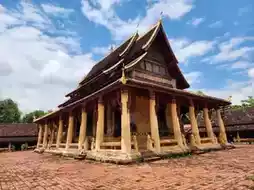 Wat Sisaket in Vientiane, Laos, is heavily influenced by Rattanakosin art in its ordination hall and library. It is one of the few temples that were not destroyed during the Siamese invasion, which might explain why it survived the destruction. The ordination hall features a Vientiane-style design with elevated side roofs, differing from the low, ground-hugging roofs typical of Luang Prabang and Xieng Khouang. Surrounding the hall is a veranda resembling those found in many Rattanakosin-style temples. The door and window frames are in the shape of a mandapa, similar to the ordination hall of Wat Phra Si Rattana Satsadaram in Bangkok, but the roof follows the Lan Xang style, with unglazed tiles and a central spire or finial typical of Lan Xang architecture. The surrounding cloister houses 120 life-sized Buddha statues of the same style and era. The mural paintings inside the ordination hall were restored in 2014.
