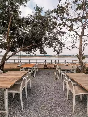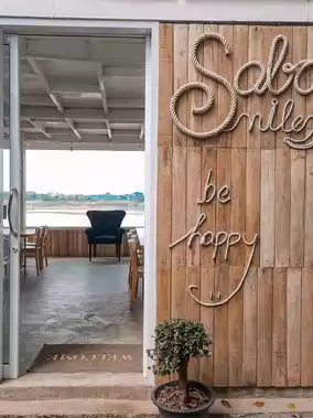 Sabai Jai Cafe & Camp is located on the banks of the Mekong River in Hat Kham Subdistrict, Mueang Nong Khai District. This cafe offers a beautiful atmosphere surrounded by nature and a stunning view of the Mekong River. You can even see the Lao PDR border on the other bank very close by. It's perfect for a meal, coffee, or relaxing in the afternoon or evening while watching the beautiful sunset over the Mekong River. It truly exudes a sense of "relaxation," just as the name suggests. I heard they have live music at night. If you've been here at night, please share your experience. I went for lunch in the afternoon and the food was delicious, and the coffee was excellent. My favorite spot was the seating under the rain trees. I wanted to open a book and lie down, enjoying the view of the Mekong River and the gentle breeze. Just thinking about it is so relaxing.