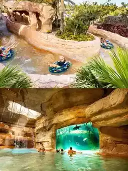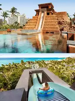 👉 The Cove at Atlantis: As a hotel, it features the world's most thrilling water park, where people drop vertically from the Mayan Temple into a 60-foot underwater tunnel, with sharks watching from outside the glass.