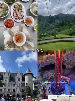 Take the cable car up to the French village, Ba Na hills, about 20 minutes to get there (the atmosphere while taking the cable car is beautiful all the way). When we arrived, check in at the Mercure hotel, change clothes, take pictures, walk, see Popmart, play the rides in the Sun World zone (there are a lot of rides, and there are a lot of people as well). Then in the evening, go play in the hotel's pool, only people who sleep up there can enter. Adult and children's pools, hot spring tubs for soaking (bring your swimsuit). After that, go to the Beer Plaza area for dinner. There are many restaurants to choose from, many styles, barbecue, burgers, pizza, etc., but the price is quite high. Most of them accept credit cards. Swipe and enjoy.