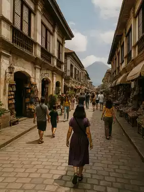 The cobblestone streets are lined with old Spanish-style buildings on both sides, creating an atmosphere where time seems to stand still.