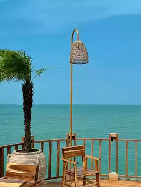 The café features a rustic yet modern design with wooden accents and open spaces, creating a relaxing, nature-friendly vibe. Its seaside location allows visitors to enjoy cool sea breezes and beautiful ocean views.