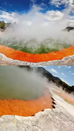 🌋 Wai-O-Tapu Thermal Wonderland: This geothermal wonderland in Rotorua is filled with bubbling mud pools, colorful geysers, and a distinctive sulfuric aroma. Highlights include Lady Knox Geyser, which shoots water 20 meters high every morning, and Champagne Pool, whose bubbles resemble champagne from carbon dioxide. The orange rim of the pool is due to natural minerals, making it seem like something from another planet.