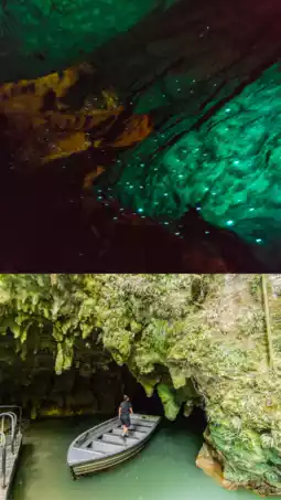✨ Waitomo Glowworm Caves, a bioluminescent cave filled with "glowworms," which are actually insects that emit light to attract prey. Take a boat trip in the dark and enjoy the shimmering lights on the cave ceiling. Feel like you're floating under a starry sky.