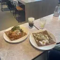 This shop specializes in crepes, galettes, and coffee☕️There are several types of galettes, both side dishes and desserts, and some are seasonal, so I want to go there again and again,,🥺This time I had the basil chicken ratatouille galette and coffee jelly milk, and I was blown away by how delicious they were!!! 😭🩵The coffee jelly was really good, as you'd expect from a roastery, and I could have drunk as many bowls as I wanted🤤The galettes are also more filling than you'd think, so I recommend them!!