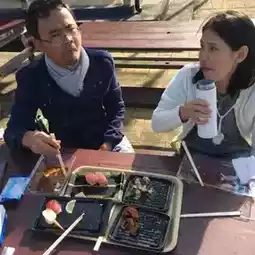 We chose to buy many things to eat outside, feeling relaxed. After we were full, we went to watch the tuna slicing show.