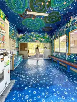 The murals at Kii-Arita Station were created by Matsuo from 2016 to 2018 and again in 2021. It took five years to complete ️🩵 The walls, ceilings, and floors of the station building are painted with the sea, mountains, coral, fish, owls, and more. In particular, in 2021, students from Kushimoto Nishi Elementary School participated in the production and painted colorful circles on the front wall ✏️