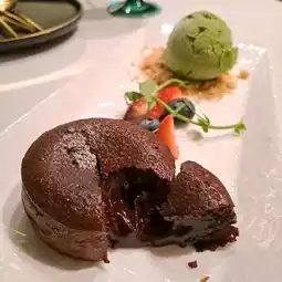 The cake is crispy on the outside and soft on the inside, with the chocolate heart flowing out when cut open, accompanied by smooth ice cream, a sweet and delicious dessert.