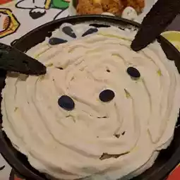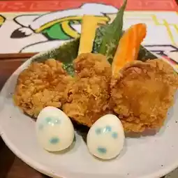 Served with fried chicken, egg strips, crab sticks, okra, and seaweed, the bowl features a PC Dog design. The udon is covered in smooth white cream, with a rich black truffle broth underneath, giving it a unique texture.