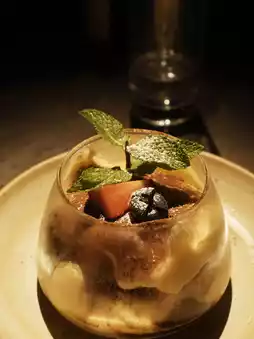 Presented like a mini glass terrarium 🪴, it is soft and moist, with a hint of 🍾 alcohol and 🍫 chocolate flavor, with a sufficiently moist bottom layer.