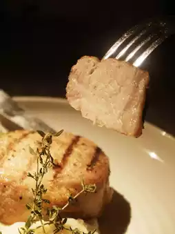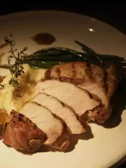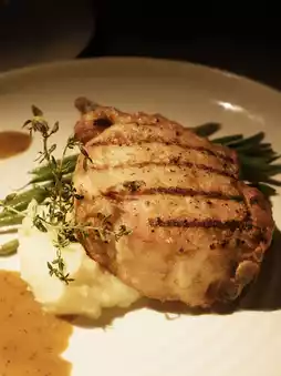 The pork chop is thick, and the restaurant uses charcoal grilling to lock in the juices, with a smoky aroma 😍, perfectly cooked 🤩, the sliced pork chop is juicy and tender 🤤, served with crisp green beans and mashed potatoes with potato chunks for added texture, and a rich buttery flavor!