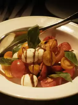 Drizzled with balsamic vinegar over red and yellow cherry tomatoes and cheese balls, the dish is appetizing 😍, not greasy, with a rich cheese flavor, simple and delicious 😘.