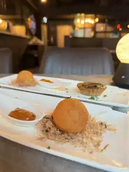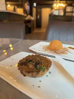 ▫️ There are 5 appetizers, the focus is of course 2 oysters per person 😼 quite fresh and big enough meat 🦪 marinated salmon and goose liver sauce toast plated quite beautiful, taste normal play 🫶🏻 wild mushroom pie black truffle flavor quite fragrant ~ fried shrimp cheese really has a shrimp inside quite special 🦐