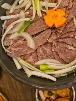 We ordered a medium-sized beef brisket hot pot to share between the two of us. It uses 1++ grade Korean beef, and the pot also contains onions, mushrooms, and other vegetables. The broth is very clear and sweet. The amount of beef is quite generous, covering the entire pot. The meat is tender and flavorful, and dipping it in the onion sauce makes it even more delicious.