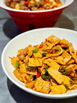 Quick stir-fry over high heat brings out the "tiger skin" pattern. Bite into the tofu’s rich bean aroma, and pair a bite of smoked tofu with chili stir-fried pork to open up your appetite.